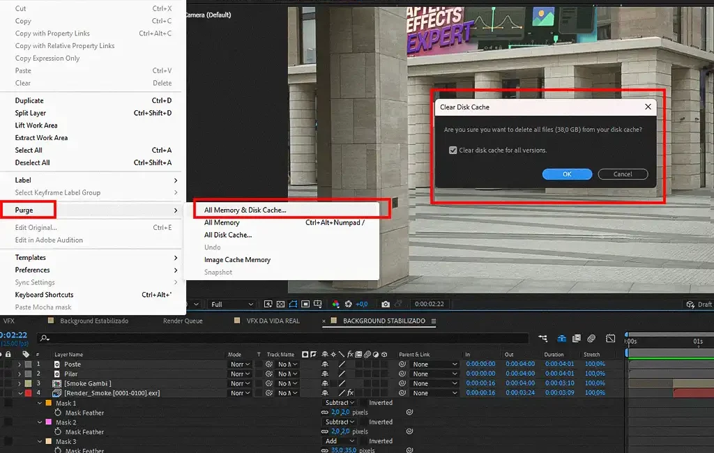 Limpar o Cache, se você nesse post já vindo procurar essa solução recomendo que leia o início dele, e aprenda a configurar e a limpar o Cache do seu After Effects.